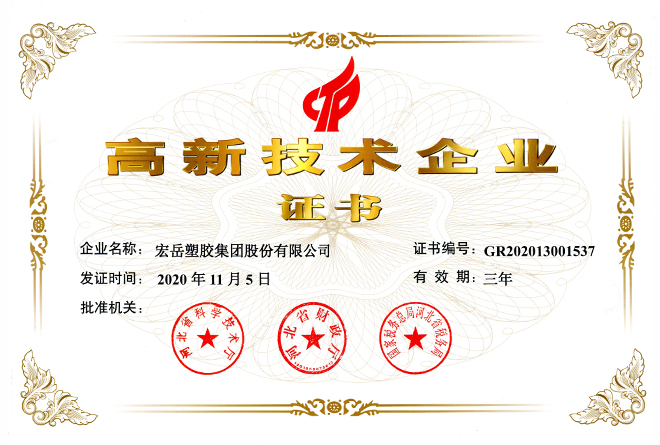 开云(中国)被认定为河北省高新技术企业,开云(中国)牌塑料管材管件被认定为国家免检产品。