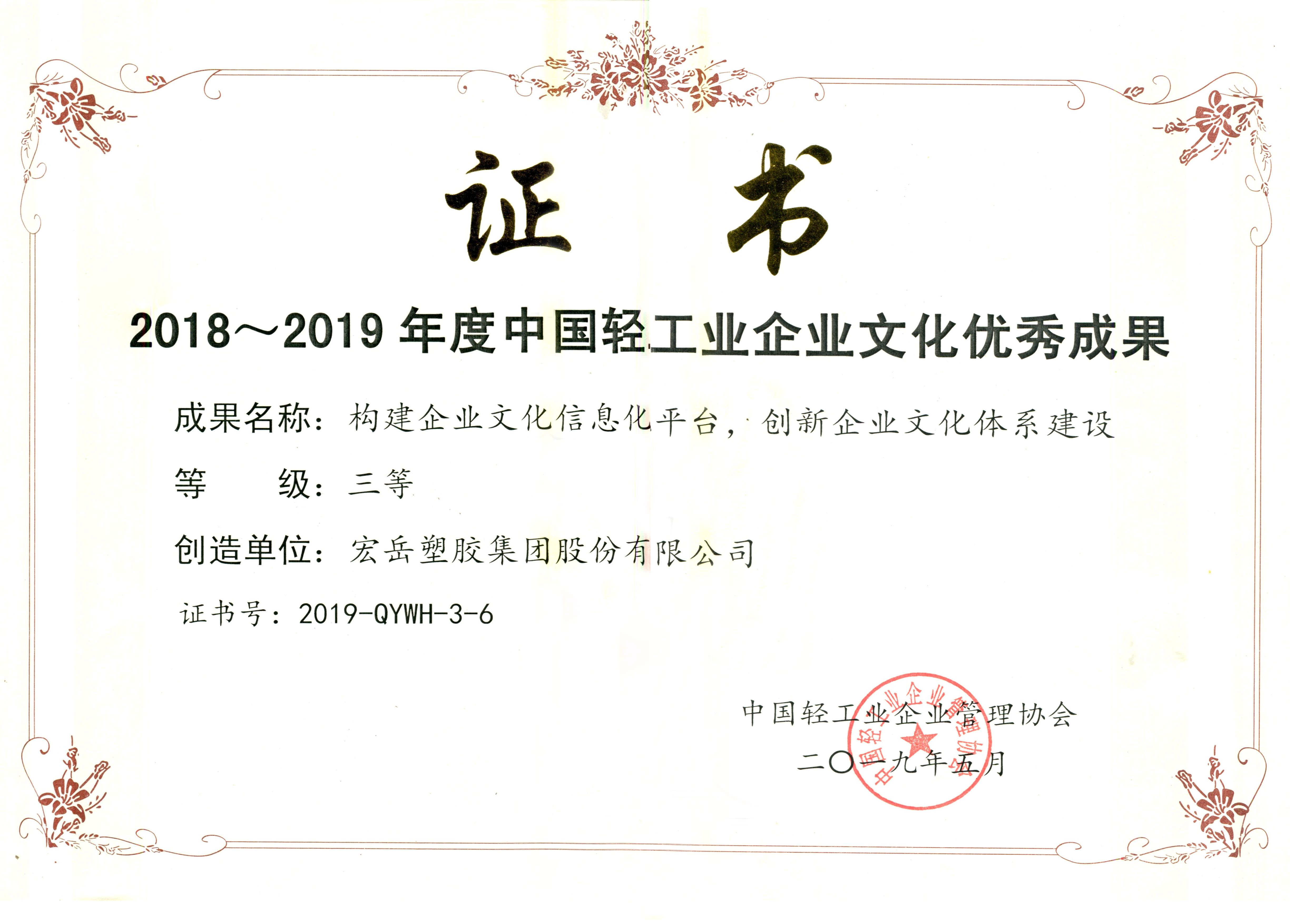 5月17日,中国轻工业企业管理协会第四届第五次理事(扩大)会议暨2019年轻工业企业文化建设经验交流会在郑州召开,开云(中国)集团申报的“构建企业文化信息化平台,创新企业文化体系建设”项目成果荣获2018~2019年度中国轻工行业企业文化优秀成果三等奖。
