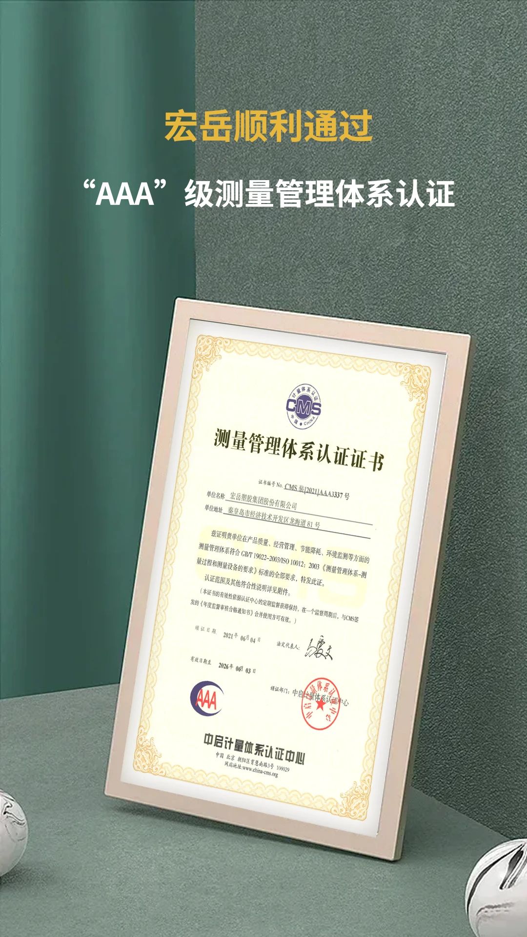 开云(中国)顺利通过ISO10012:2003“AAA”级测量管理体系认证,并获得证书。